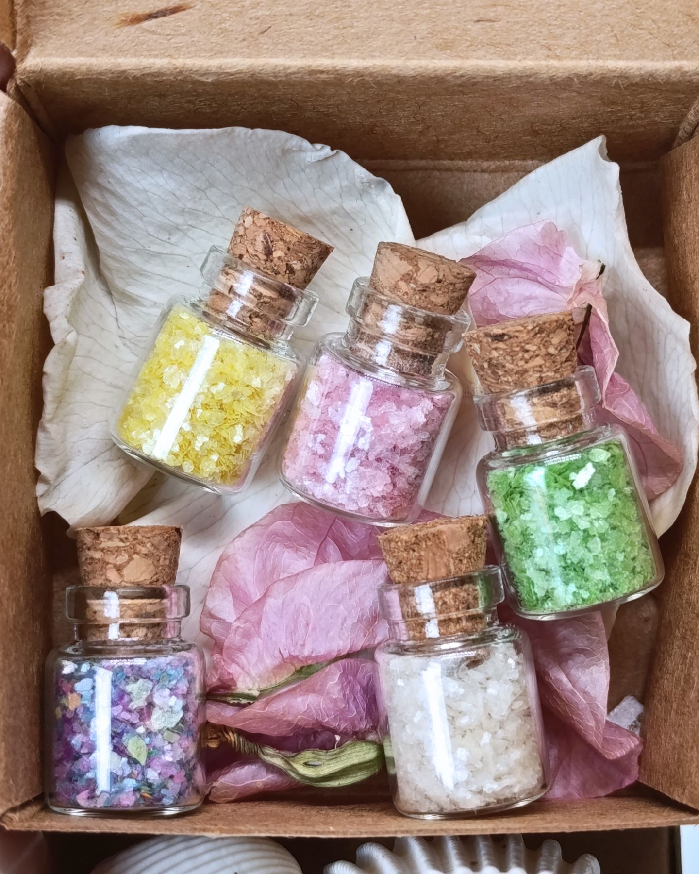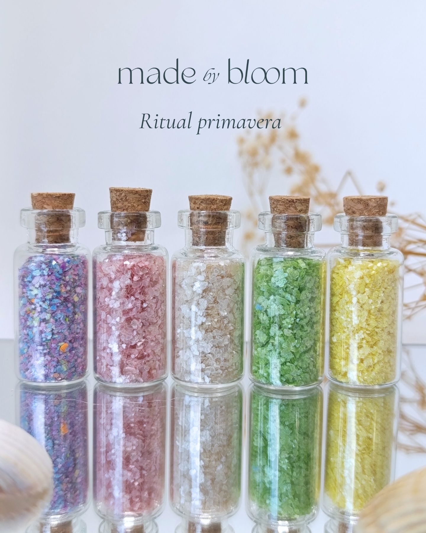Ritual Primavera: 5 frascos tamaño S en escamas (Verde hoja, Amarillo sol, Azul agua dulce, Rosa flor y Blanco perla).
