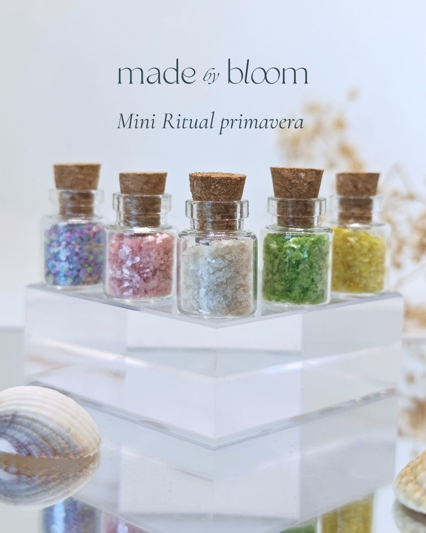 Mini Ritual Primavera: 5 frascos tamaño XS en cristal, con los mismos tonos.